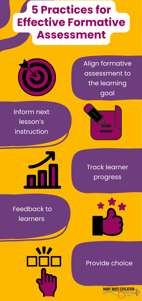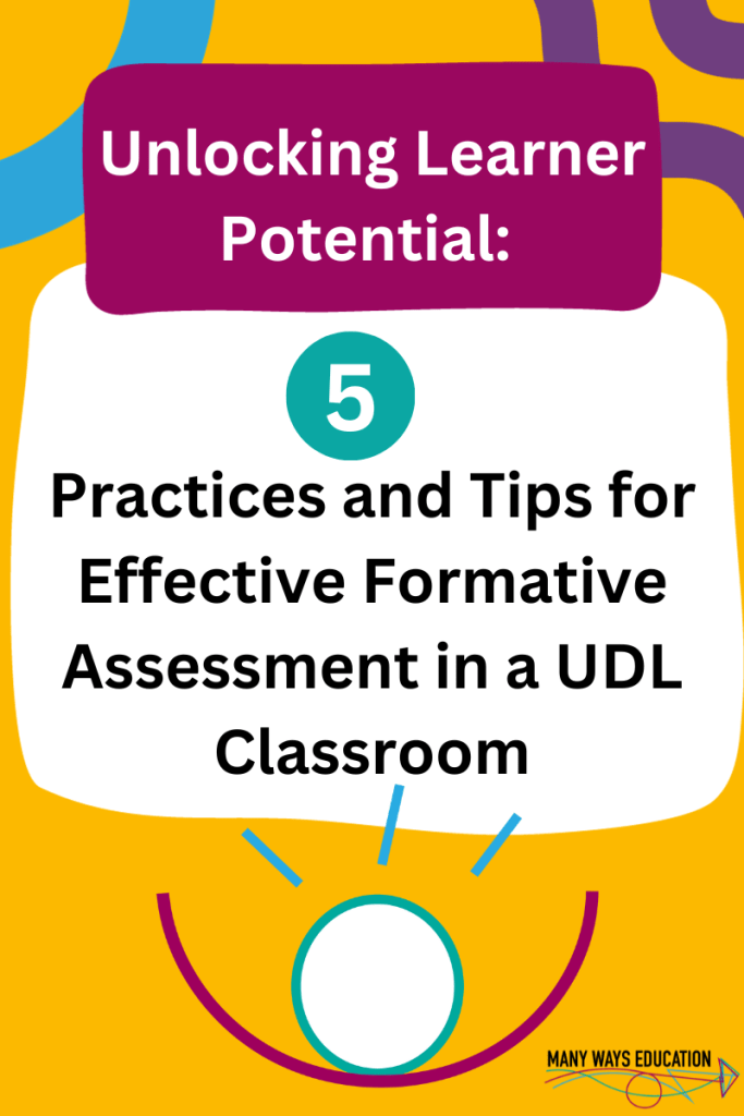 When we plan using elements of a UDL lesson, formative assessment is at the forefront of designing the learning experience. But formative assessment should not just be a task that learners do during a lesson. It doesn’t just stop there. In order for formative assessment to be effective, we need to implement practices that allow us to inform our teaching, monitor learner progress towards a goal, provide feedback and offer choice for our learners.