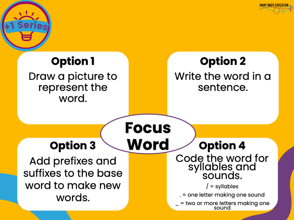 We all know how important vocabulary is to reading comprehension and the importance of teaching vocabulary explicitly (Fisher et al., 2016). This routine is used after the explicit teaching of vocabulary. This routine allows learners to review and apply their understanding of the focus word in different ways. These options include using the word in a sentence, drawing a picture of what the word means, creating words based on the word’s base word and identifying syllables and sounds in the word. These choices also support challenge in the different levels of challenge the activities have and the amount of activities learners can complete.